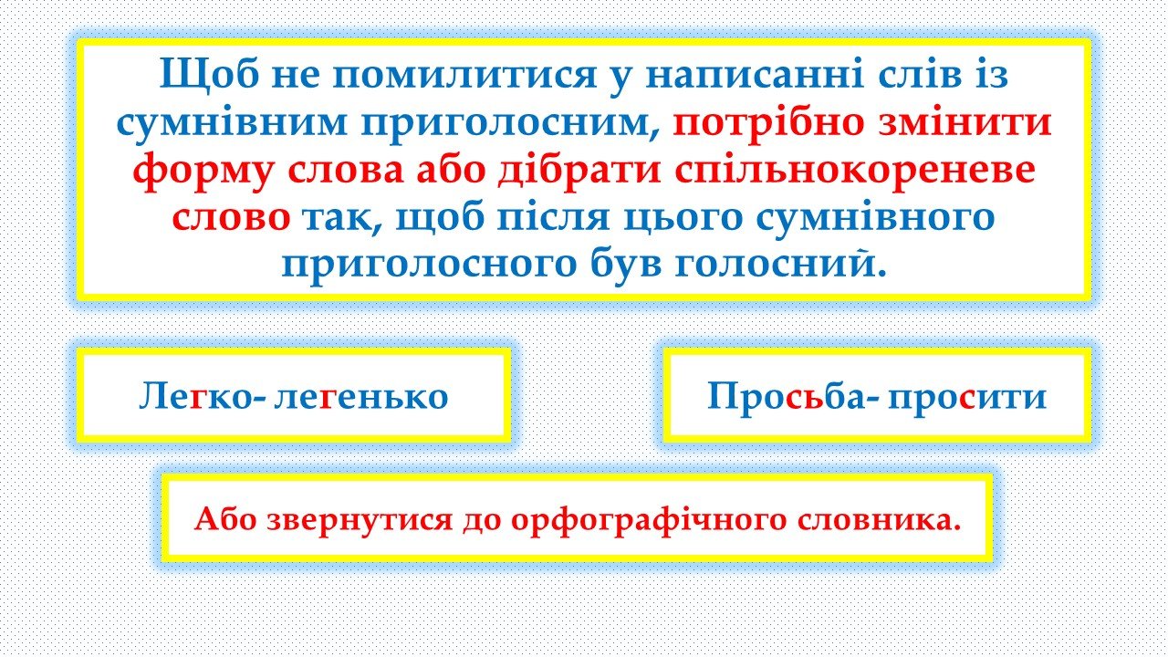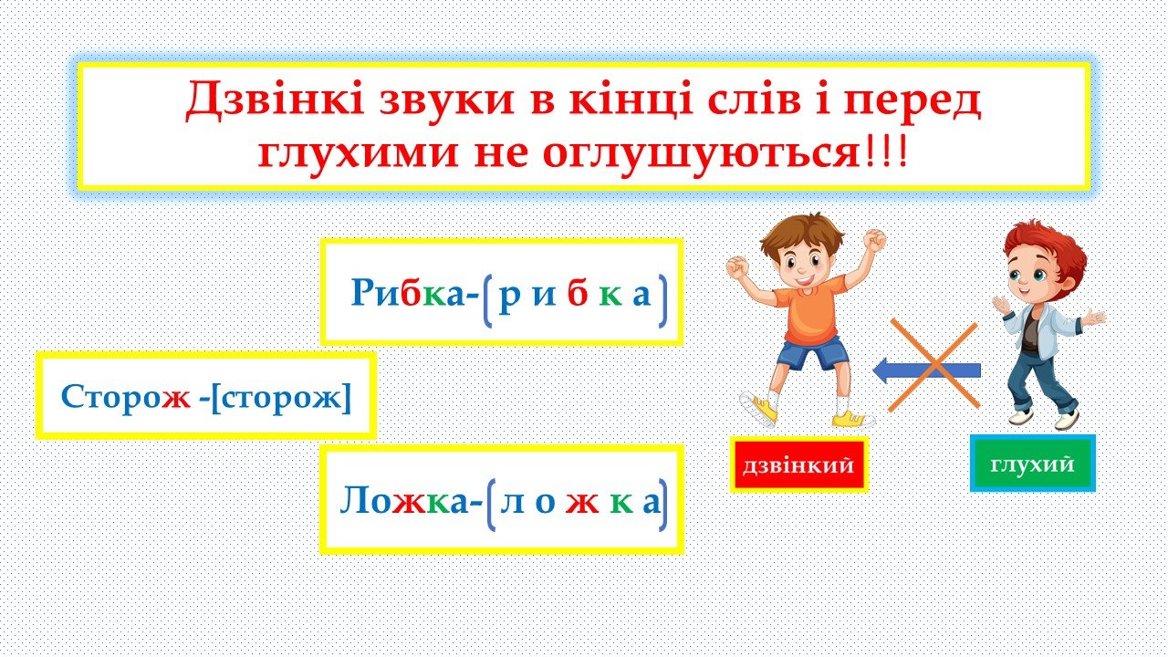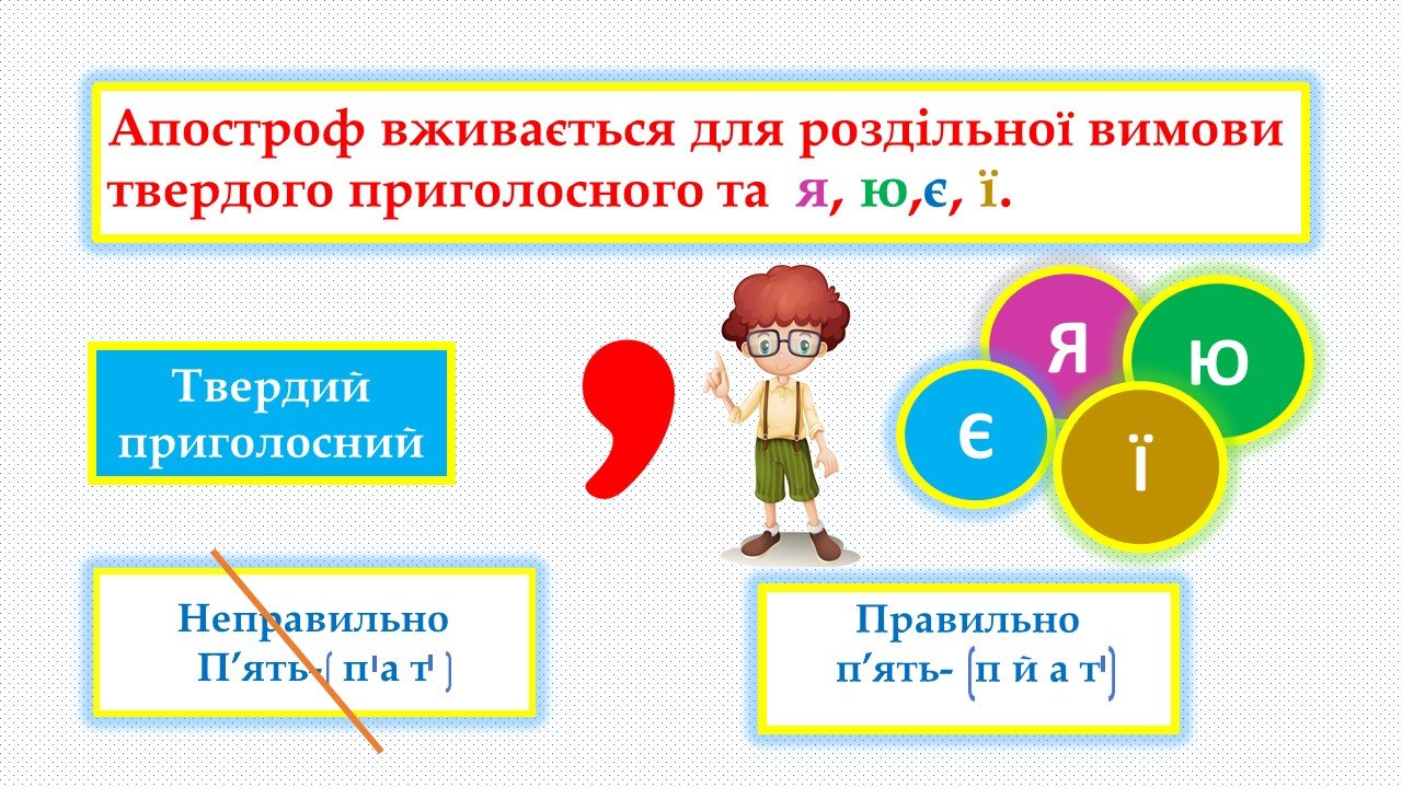 Апостроф вживається для роздільної вимови твердого приголосного та я, ю,є, ї.Якщо два приголосні звуки стоять поруч, один із звуків може уподібнюватися до того, біля якого він розташований. Глухі приголосні перед дзвінкими вимовляються як парні їм дзвінкі.Щоб не помилитися у написанні слів із сумнівним приголосним, потрібно змінити форму слова або дібрати спільнокореневе слово так, щоб після цього сумнівного приголосного був голосний.Уподібнення за м’якістю. Уподібнення за місцем творення.