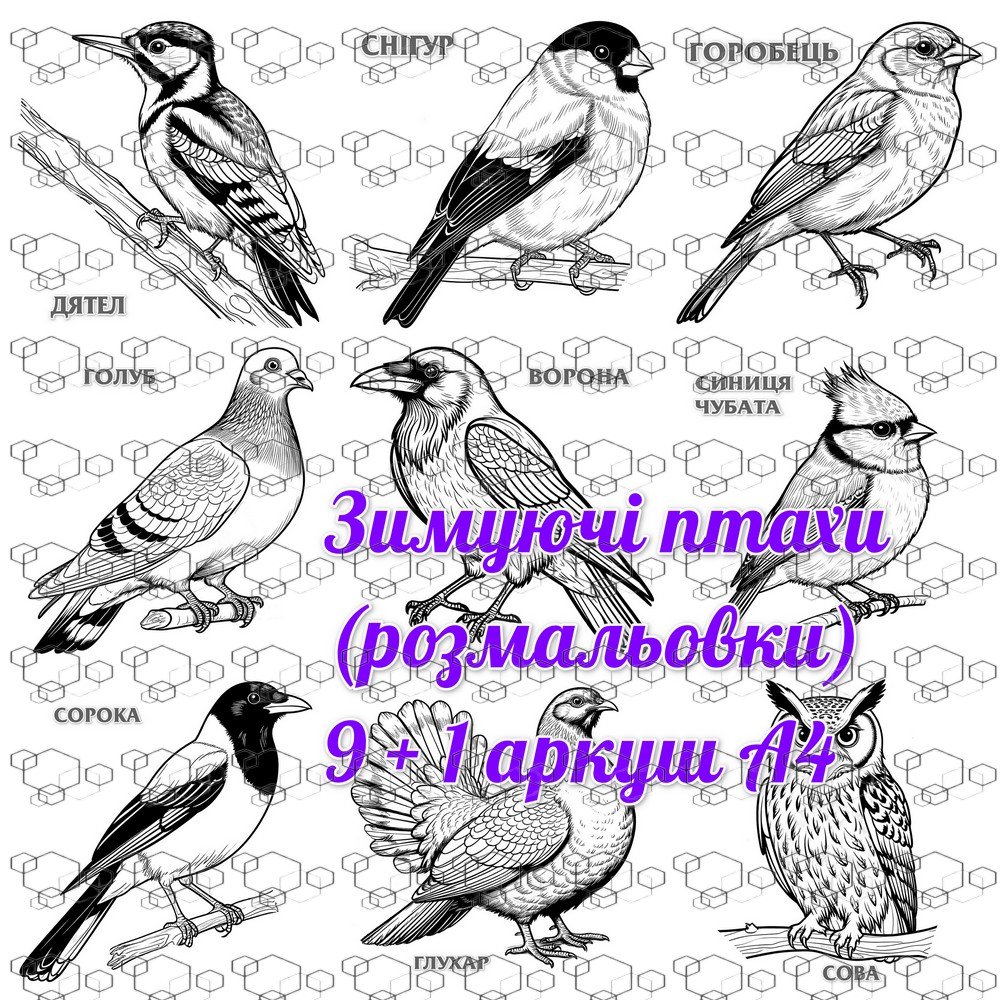 9 контурних малюнків зимуючих птахів із назвами + 1 малюнок загальний. До друку 10 сторінок А4.